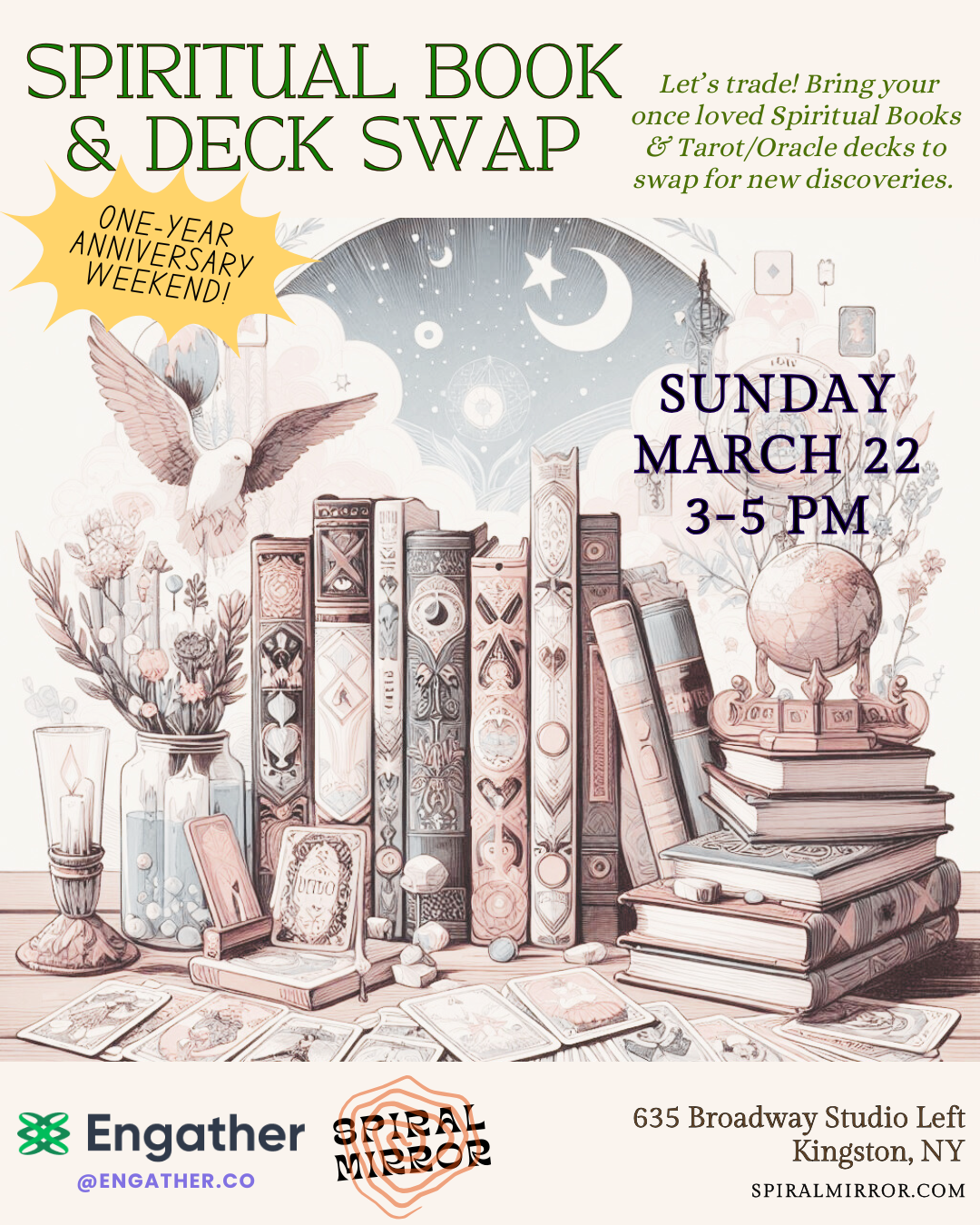 We’re once again collaborating with Engather, the local gift economy platform, for a Book & Deck Swap! Bring a deck or a book or two for someone else, and leave with something new (to you).