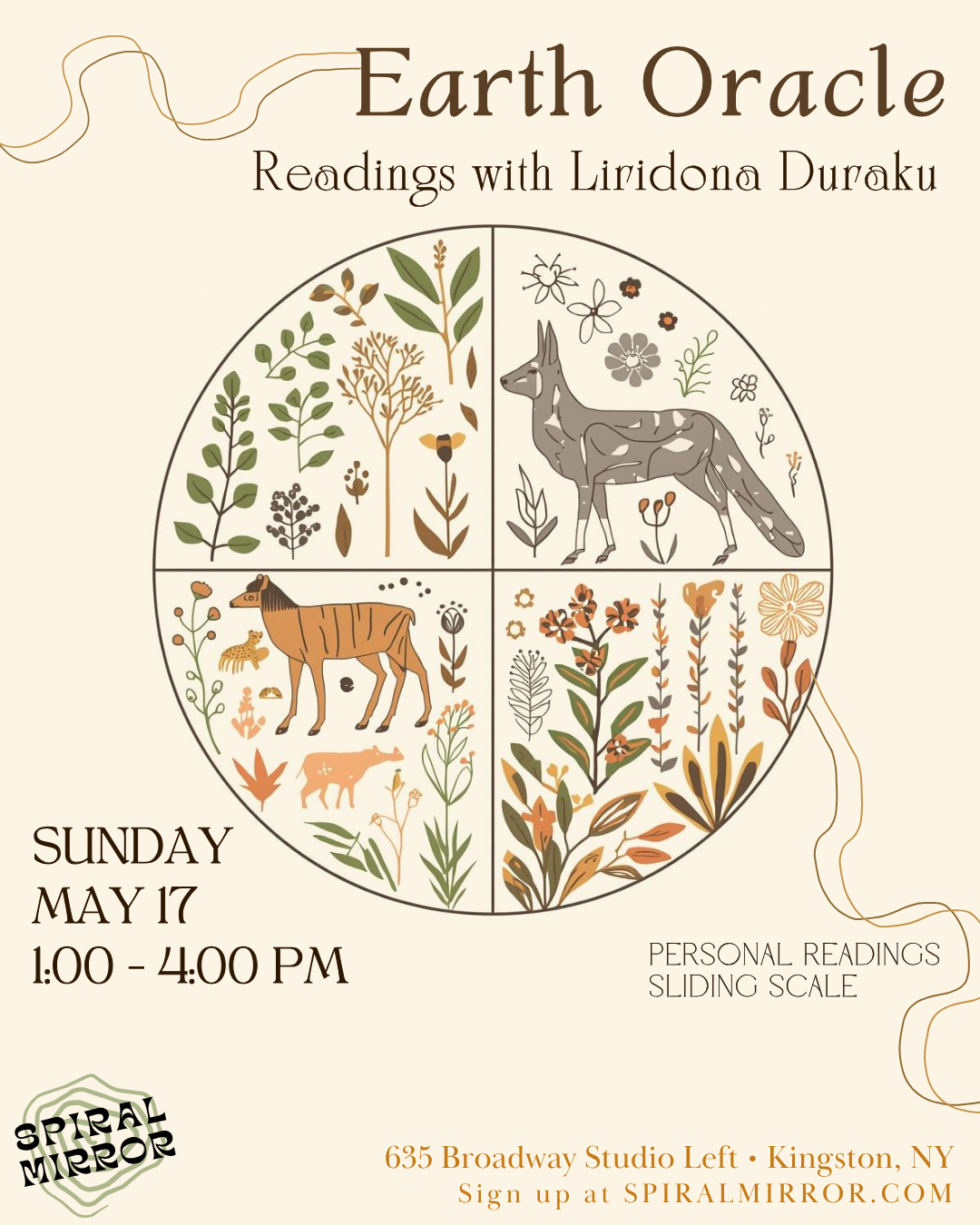 The reading begins with an honoring of and invitation to the spirits and ancestors of the land. You’ll then have an opportunity to explore a question, which will be responded to through channeling, scrying, and other forms of divination, such as Tarot and animal or plant oracle decks.