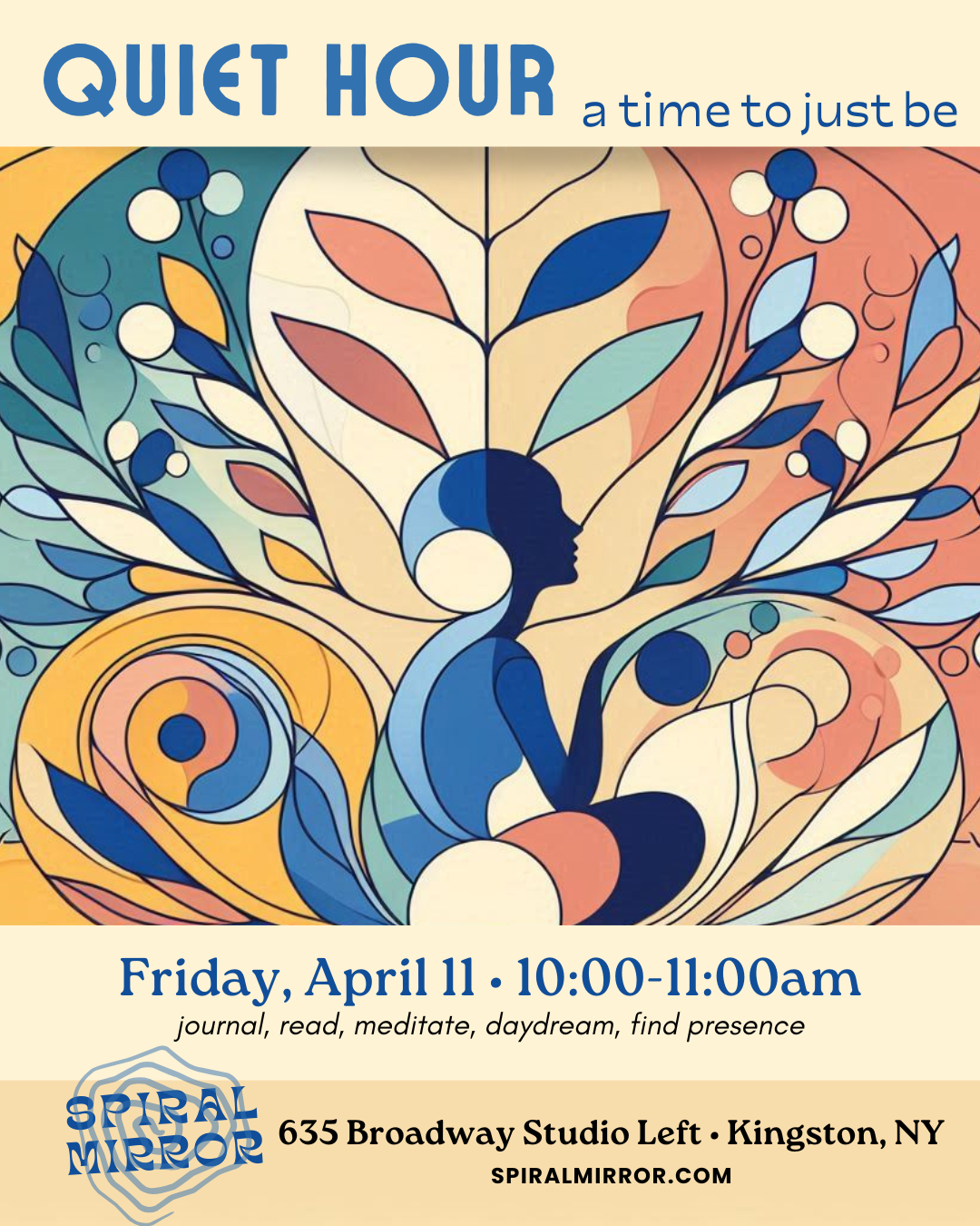 QUIET HOUR is exactly what it sounds like—a peaceful hour in a peaceful space. An hour to connect with yourself. Spend it however you’d like: in contemplation, meditation, reading, journaling, daydreaming, cultivating presence. It will be a screen-free, music-free, conversation-free zone.