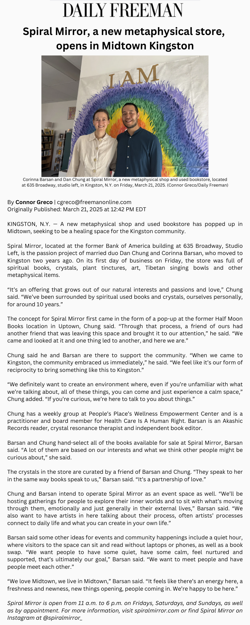 This week launches IONE's 30th Annual Dream Festival! The Dream Team chat and dream share (with a little Dream Action Theater) with Corinna Barsan and Dan Chung, owners of Spiral Mirror in Midtown Kingston. Spiral Mirror is a community space and metaphysical bookstore with crystals, plant tinctures, and consciousness-exploring events in midtown Kingston at 635 Broadway.